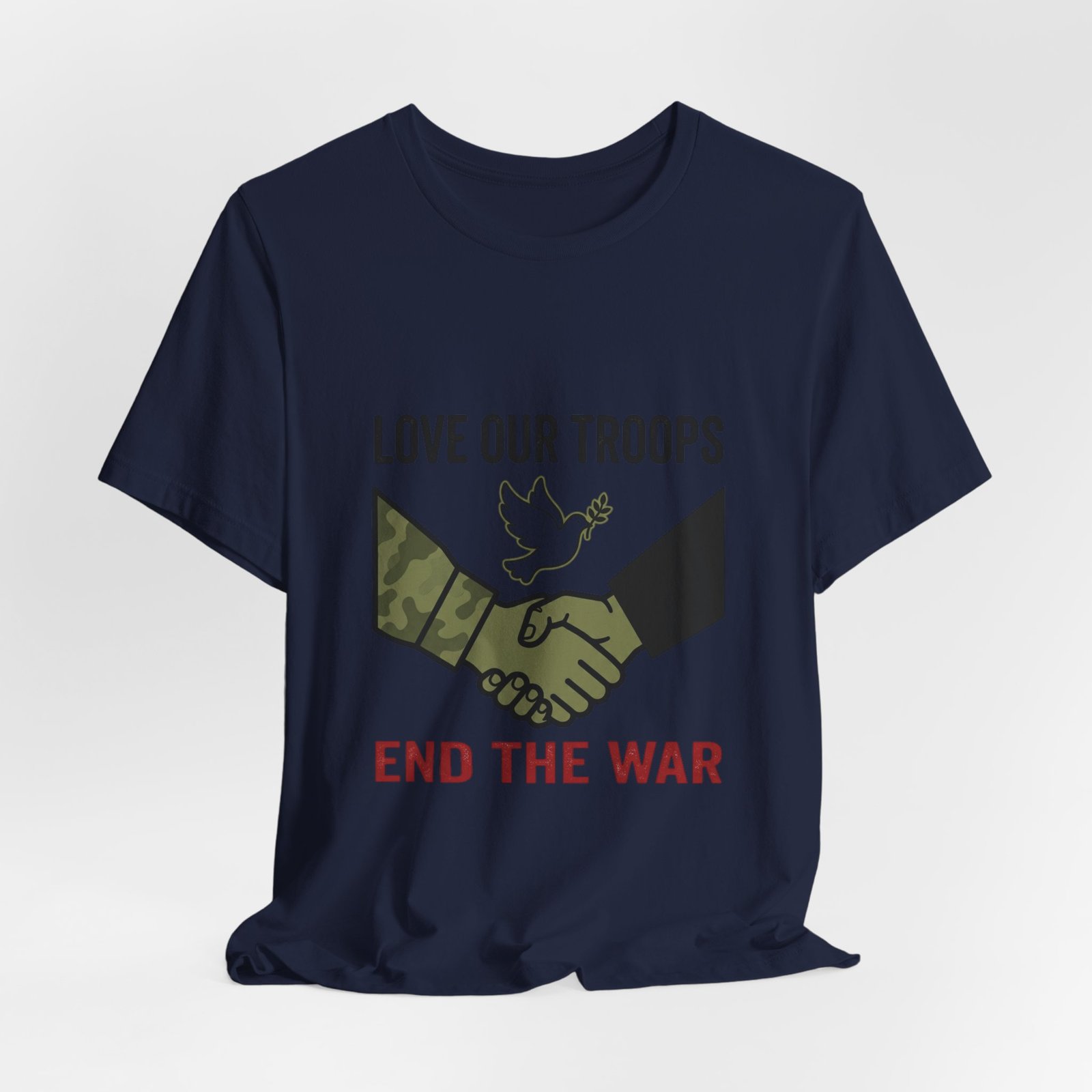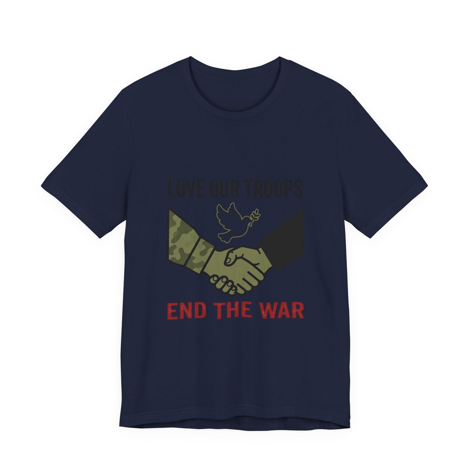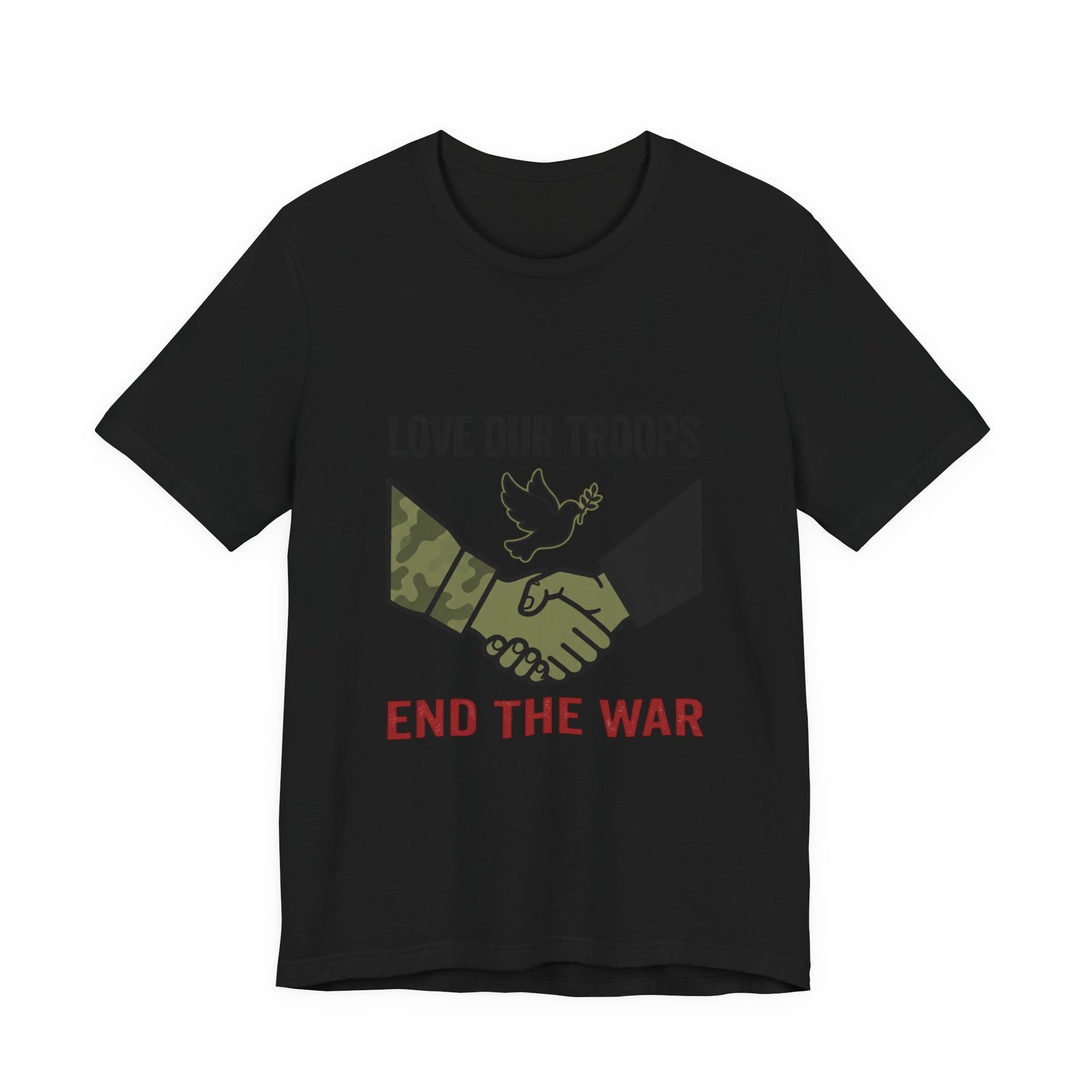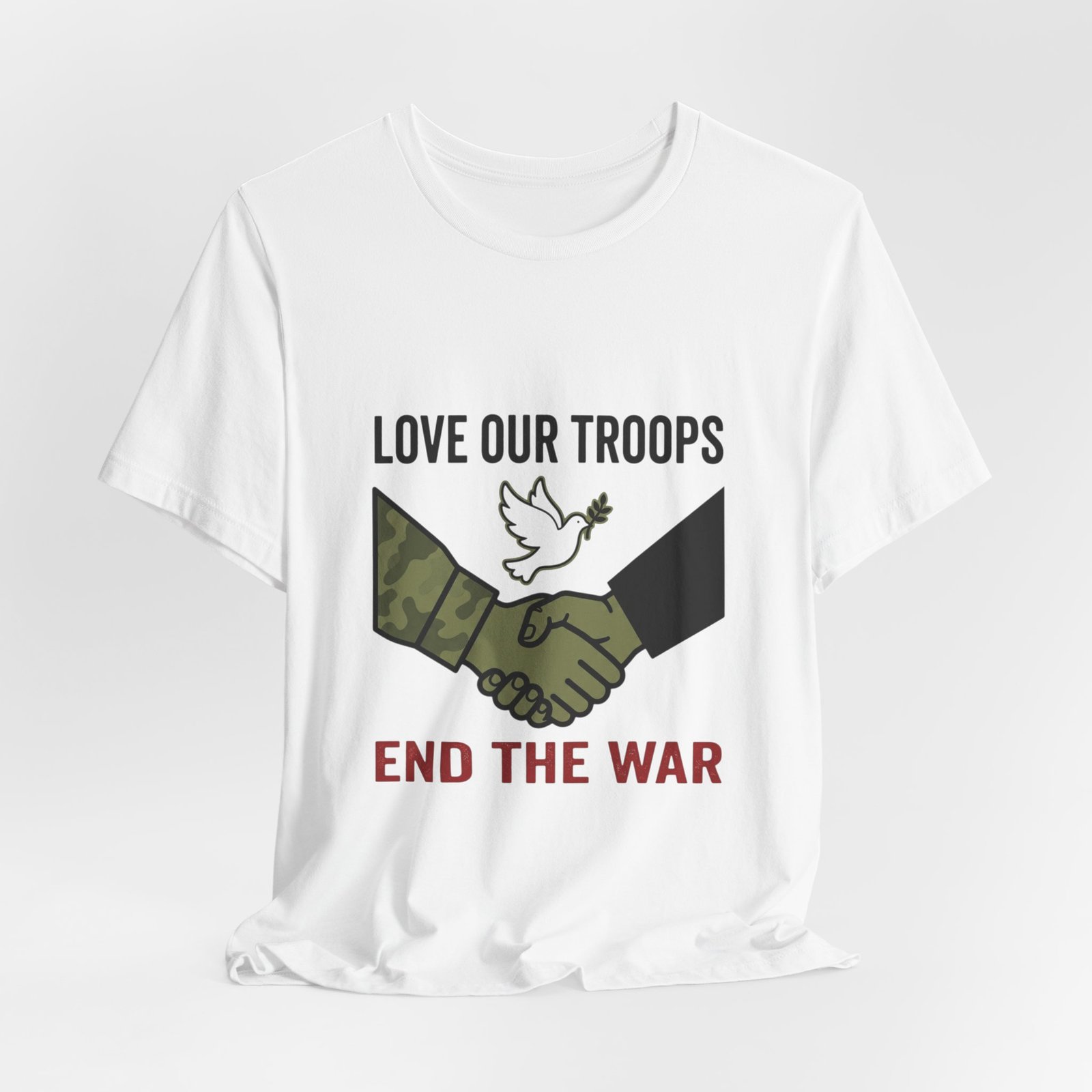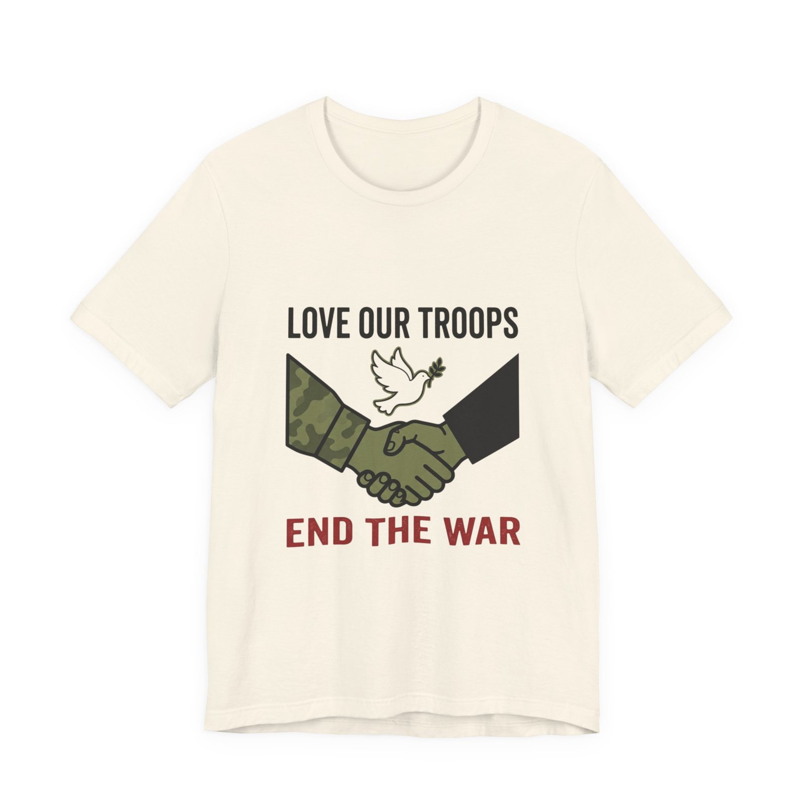 Resolute, slogan-driven tee that pairs protest-style clarity with a conciliatory visual: a camo and black-sleeved handshake beneath a small dove motif, anchored by bold text calling to “End the War.” The design uses stark, grounded tones and simple iconography to communicate anti-war solidarity without partisan language. Lightweight cotton construction and a classic crew neckline make it wearable for rallies, everyday activism, or quiet public statements of care for service members and civilians alike.