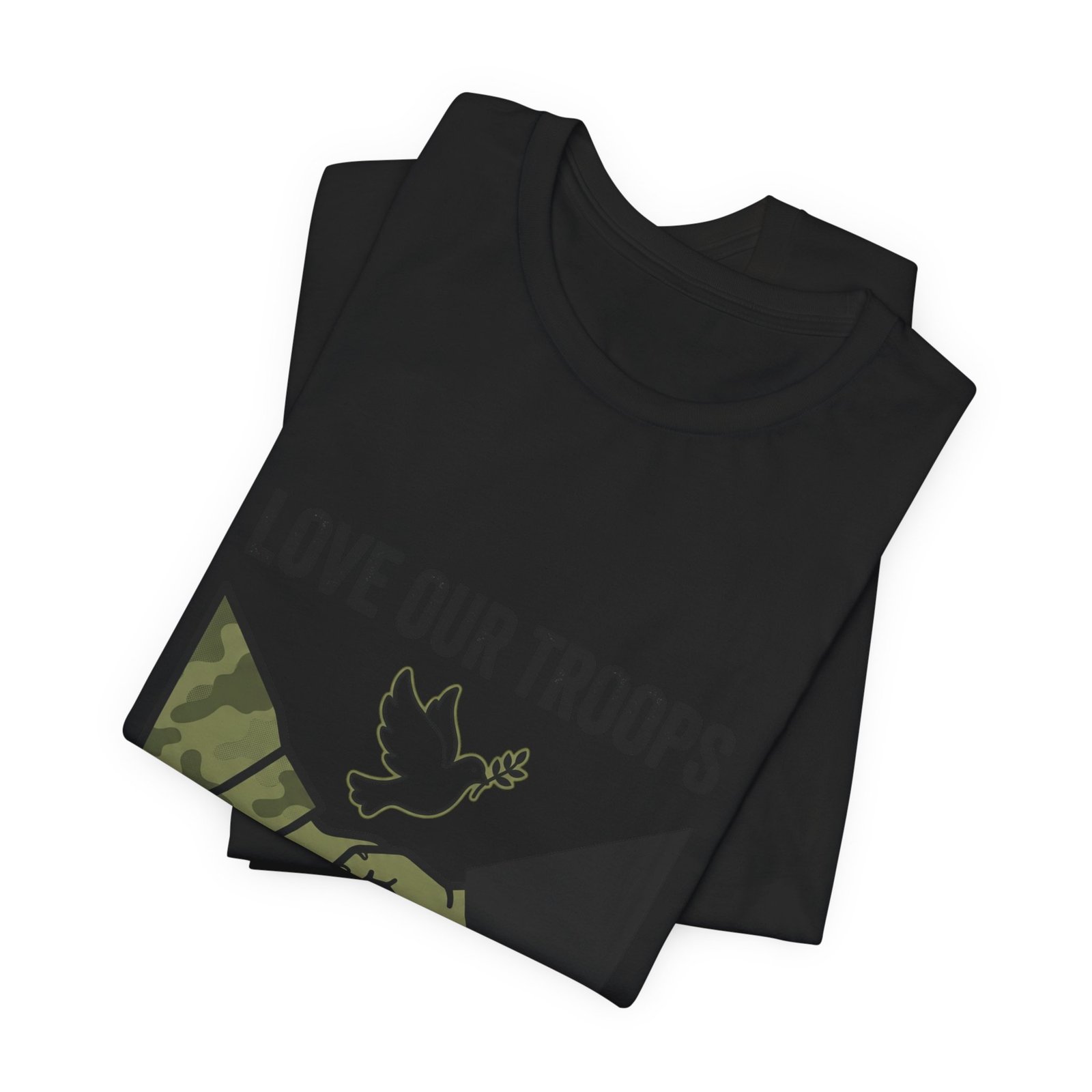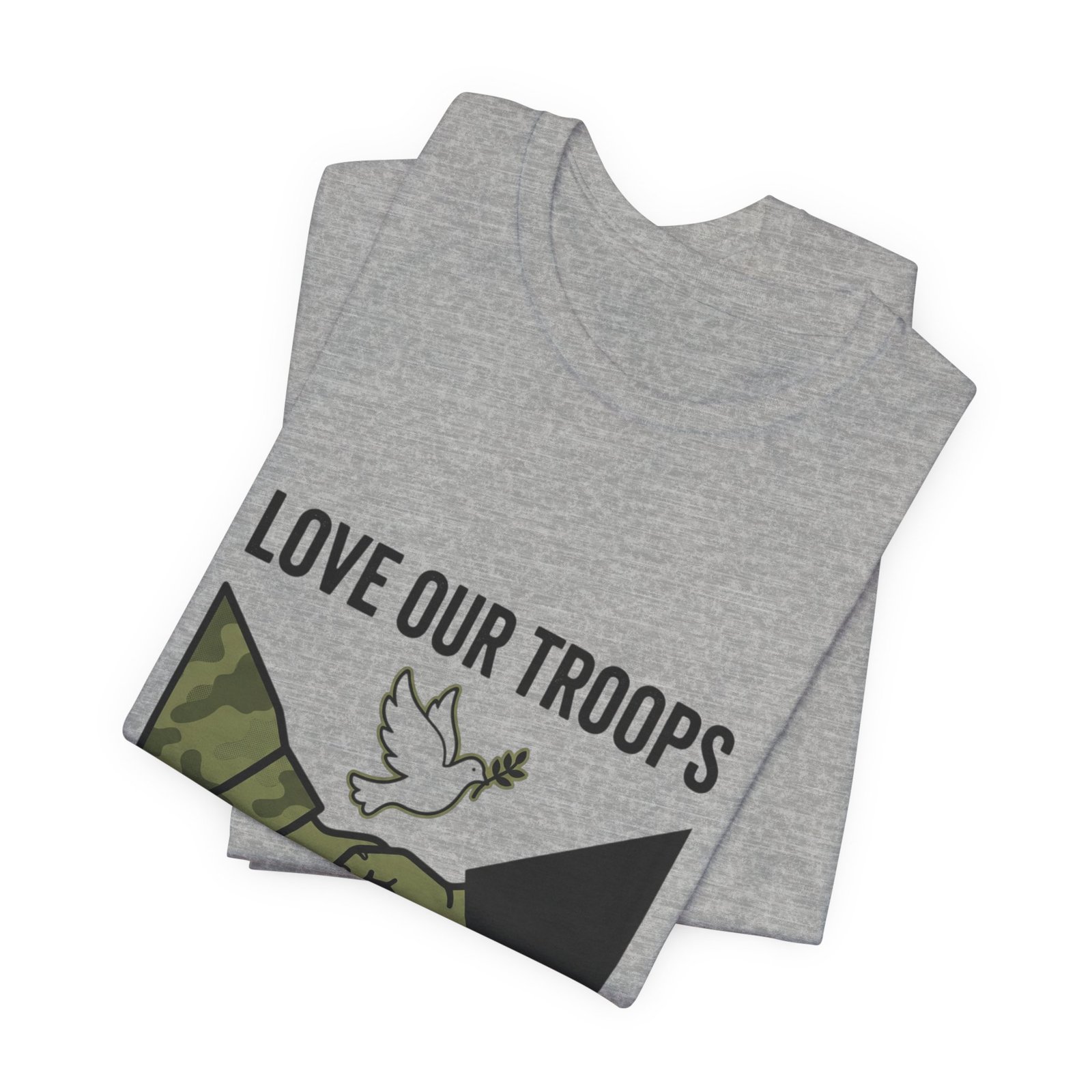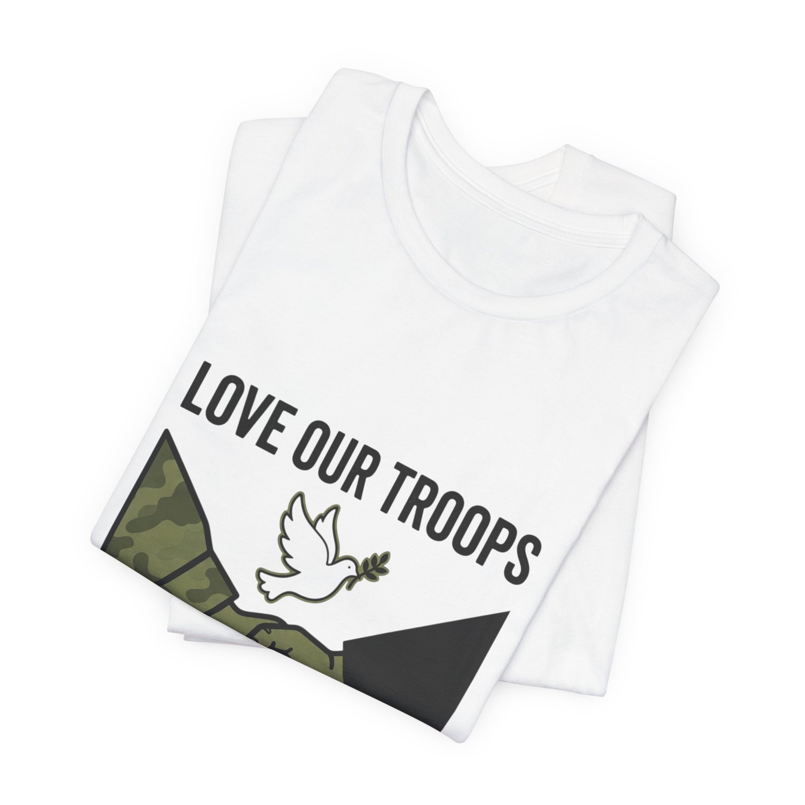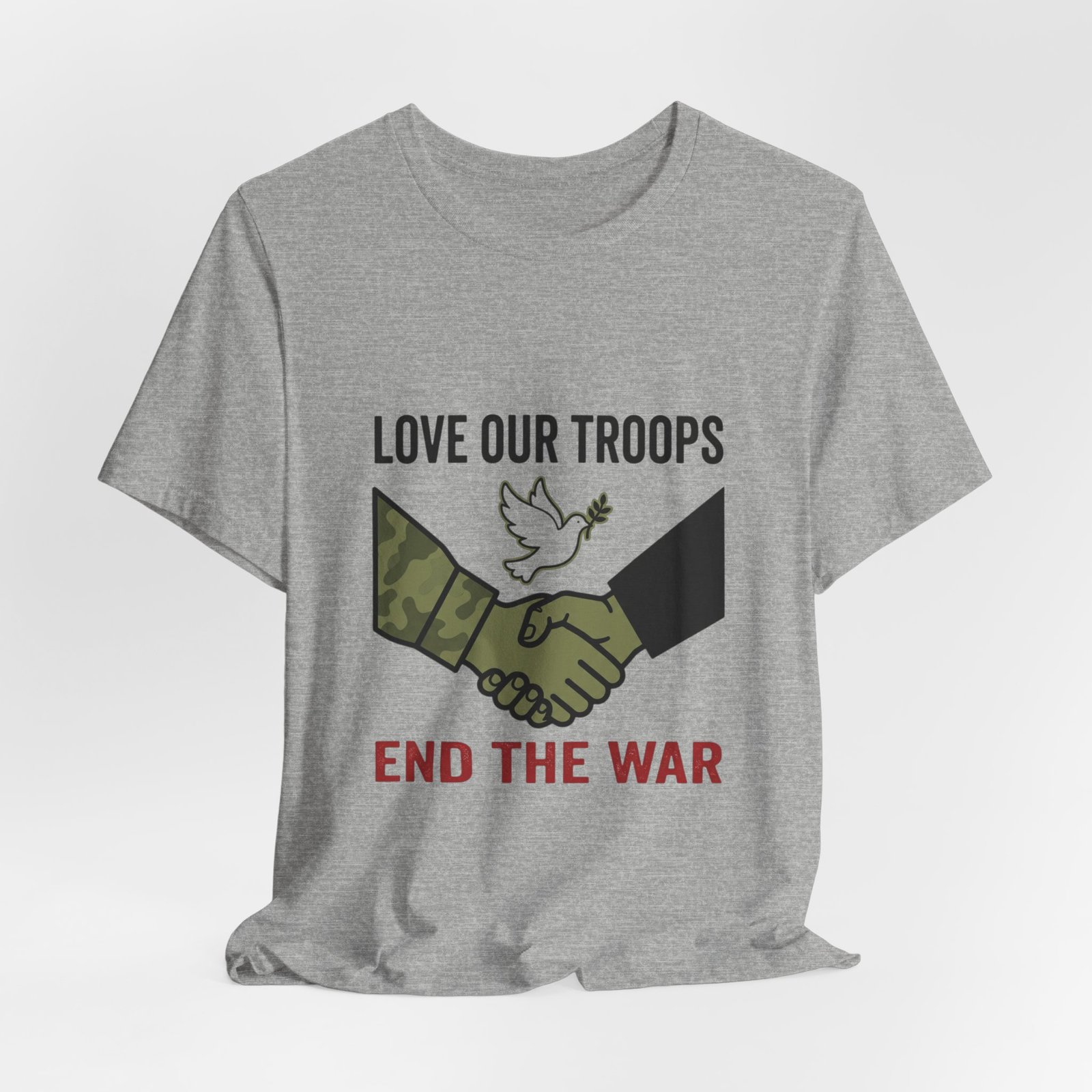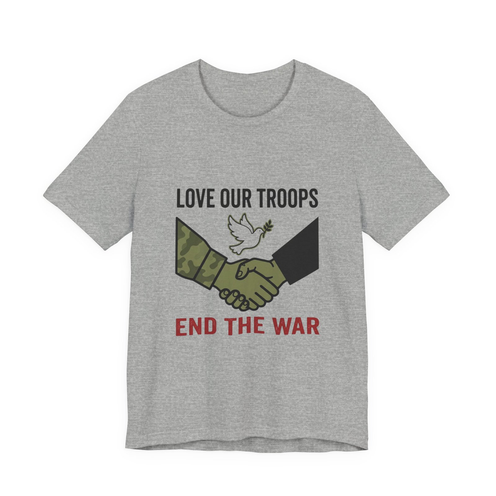 Resolute, slogan-driven tee that pairs protest-style clarity with a conciliatory visual: a camo and black-sleeved handshake beneath a small dove motif, anchored by bold text calling to “End the War.” The design uses stark, grounded tones and simple iconography to communicate anti-war solidarity without partisan language. Lightweight cotton construction and a classic crew neckline make it wearable for rallies, everyday activism, or quiet public statements of care for service members and civilians alike.